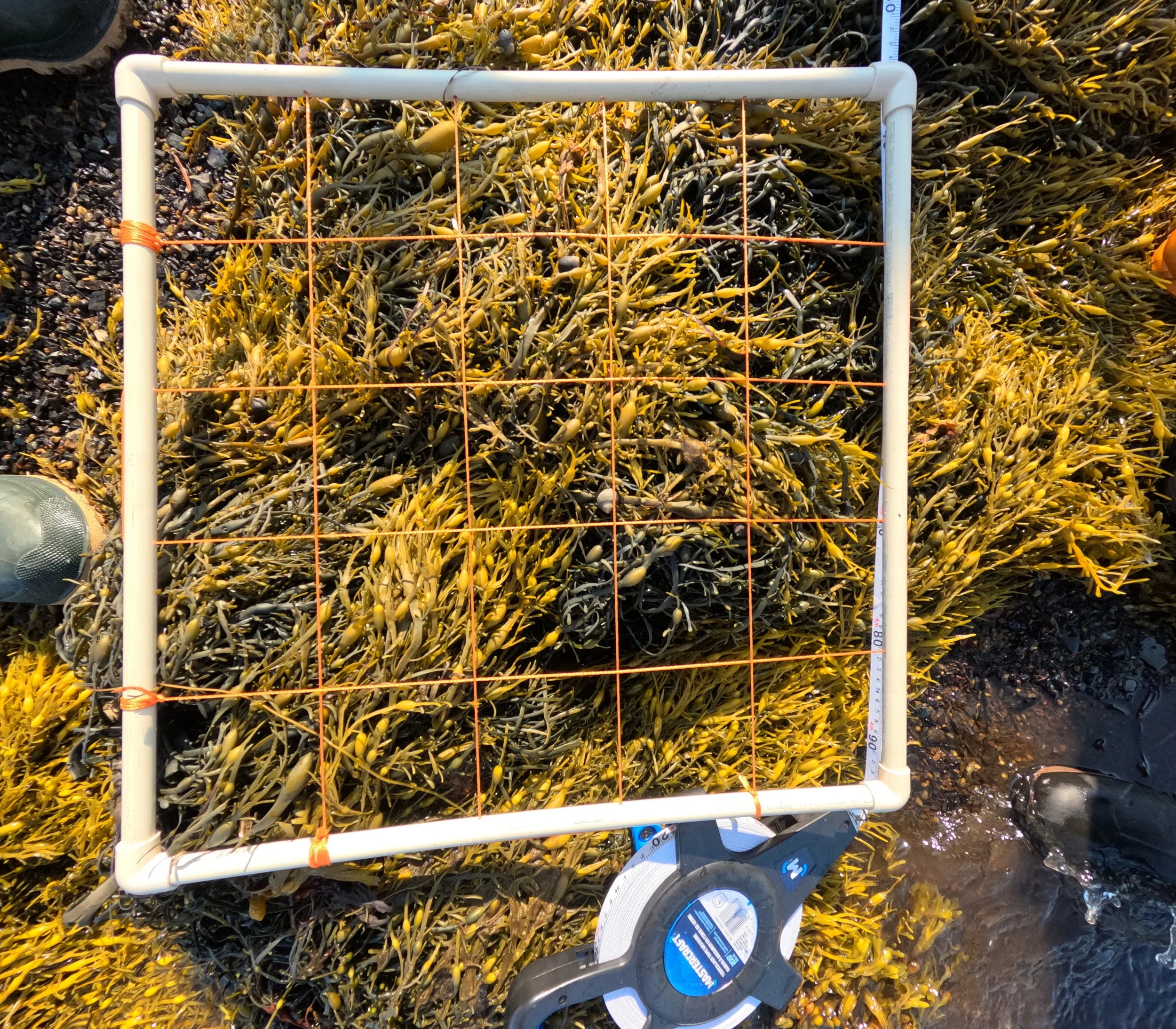 Dividing the Mahone Bay Living Shoreline into even transects (or sections), the team placed quadrats on set points along the transect line. Staff then documented the habitat material and identifiable species in the marked quadrat sections.